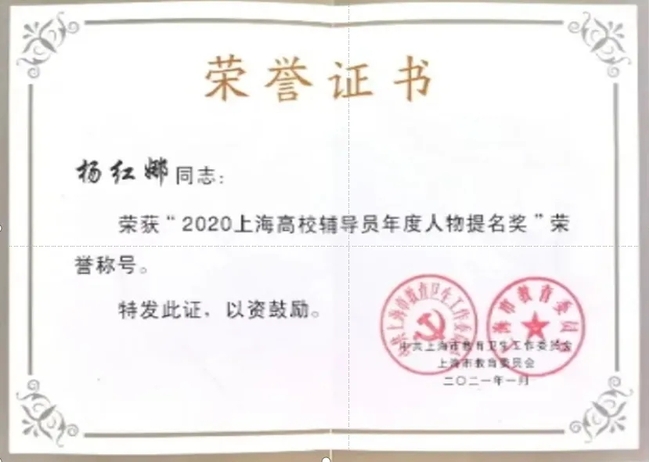 杨红娜老师始终将每个员工放在心里,悉心指导,用心引导。作为思政辅导员,杨红娜老师受到各方的肯定,先后获得上海市育才奖、校优秀教育工作者、“我心目中的好老师”提名奖等荣誉。