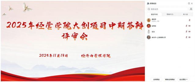为了系统地评估老员工创新创业项目的阶段性进展情况,强化过程管理,提升创新创业项目质量,11月13日,经管学院对2025年立项的老员工创新创业项目组织进行了中期答辩评审会。上海市工程管理学会秘书长耿秀丽、上海立信会计学院金融学院副经理吴杰和上海海事大学经管学院副经理肖光年作为特邀校外专家参加本次评审会。