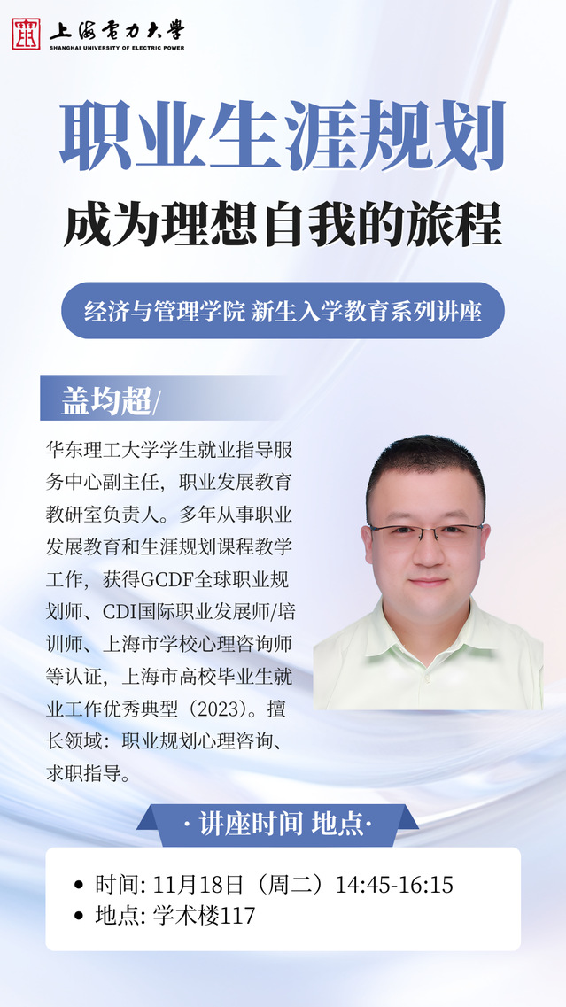 为引导新生树立科学的职业发展观念,提升生涯规划意识。11月18日,经管学院开展入学教育——职业生涯规划专题讲座。本次活动特邀华东理工大学员工就业指导服务中心副主任、职业发展教育教研室负责人盖钧超担任主讲人,以“职业生涯规划——成为理想自我的旅程”为主题,通过系统阐释五大核心理论,为同学们构建科学的生涯规划认知体系,从提升认知到付诸实践,全方位明确大学发展路径与职业探索方向。