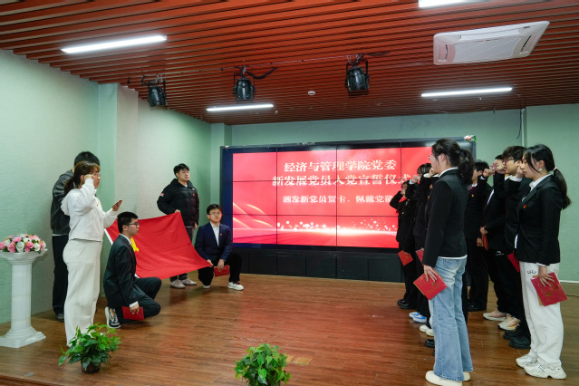 仪式伊始,潘华为新发展党员逐一佩戴党员徽章、赠送入党纪念册,庄重的仪式感传递出党组织对新党员的殷切期望。随后,全体新党员身着正装、整齐列队,面向鲜红党旗高举右拳,庄严宣誓:“我志愿加入中国共产党……”,激昂洪亮的誓言铿锵有力、回荡现场,充分彰显了新党员矢志不渝跟党走、为党的事业奋斗终身的坚定信念与赤诚担当。