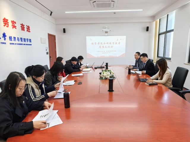 为了深入贯彻全国教育大会精神,深化本科公司产品改革,4月7日下午,经管学院组织进行了学院层面的2026年度本科公司产品思想大讨论。经管学院经理杜刚、党委副书记孟延新、信息秘书杨迎春和各系部主任、副主任参加了本次讨论会。会议由杨迎春主持。